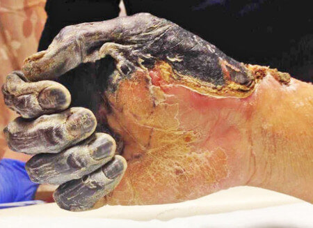 3. Consequências da artrite nas mãos. Como se sabe, não é mais possível o cuidado quando o processo inflamatório já se espalhou e provocou sépsis. Foi necessário amputar a mão do paciente e parte do antebraço, mas mesmo assim, não foi possível ajudá-lo: a infecção se espalhou por todo o corpo e o homem morreu depois de 6 meses de tratamento intensivo.